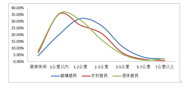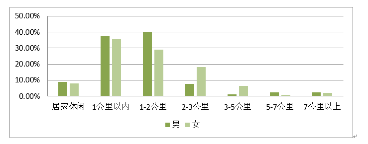 男性退休居民的休闲比女性更加彰显个性。选择2公里以内和5公里以上休闲的男性明显高于女性,而女性主要集中在2-5公里休闲半径(图11)。男性体现了“要么不动、要么走很远”的刚性气质,女性则大多表现得更平和。