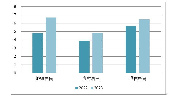 处理生理活动和无偿劳动的时间占比较高,客观上挤占了退休居民的休闲时间。与城镇和农村居民相比,退休居民的可自由支配时间较为充足,理论上其休闲时间更为充裕。2022年,每日休闲时间5.66小时,远高于同期城镇居民的4.43小时和农村居民的4.14小时。2023年,尽管有偿劳动、交通时间在不断减小,但生理活动时间增幅较大,直接导致退休居民休闲时间的实际增长落后于城镇和农村居民(图7)。这与疫情管控放开后城镇和农村居民休闲需求的短期“报复性反弹”有一定关系,“孩子们都出去玩了、需要花更多时间来自我照顾”。伴随着居民休闲时间的理性回归并步入繁荣发展新阶段,以及公共休闲服务的适老化不断提升,退休居民仍将是最有闲的群体,是休闲产业和政策的重点关注人群。