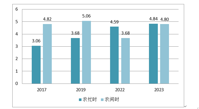 农村居民休闲意识不断增强,甚至农忙时也愿意拿出更多时间去休闲。2022-2023年,农村居民在农忙与农闲时投入有偿劳作的时间差距日渐缩小,分配到休闲活动的时间也逐渐趋于一致。在中国式现代化进程中,农村居民开始追求更加丰富多彩的文化参与和精神享受,“春种、夏耕、秋收、冬藏”的生产方式和“忙时吃干、闲时吃稀”的生活方式都发生了巨大变化(图6)。