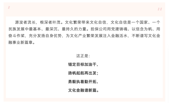 文化是一个国家、一个民族的灵魂。席大大总书记指出:“要加强公共文化设施建设,推动文化产业高质量发展,更好满足人民精神文化生活新期待。”党的二十大报告指出,推进文化自信自强,铸就社会主义文化新辉煌。国家《“十四五”文化发展规划》、重庆市《“十四五”文化发展改革规划》、集团《“十四五”发展改革规划》,都对推动文化产业高质量发展作出部署。担保公司也进一步提升认识、提高站位,主动在推动文化产业高质量发展的道路上不断探索新方法、新途径、新举措,进一步调整业务结构、丰富文化金融产品、助推重庆文化产业繁荣发展。在《重庆市“十四五”文化发展改革规划》中,提出文化产业迈向国民经济支柱性产业的目标,到2025年,文化产业增加值占全市GDP比重达4.5%。为了达成这一目标,担保公司充分发挥党建引领作用,把牢发展的主责主线,响应党中央的号召,全面落实席大大总书记对重庆重要指示要求,聚焦公司的经营特色,从以下几个方面进行了探索和努力。