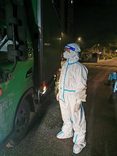 同样相信“我们一定能在这场没有硝烟的战争中取得胜利”的还有冯一马。11月22日,文化担保公司冯一马所在的小区楼栋由“高风险”区域转为了“低风险”区域后,他立即来到巴南区西流沱社区报到,投入到社区疫情防控之中。跟社区的同志沟通后,得知夜间小区外马路上卡口的值守人员紧张,冯一马当即就报了名。值守人员实行三班倒,24小时不停歇,冯一马的值守时间是凌晨12点至清晨8点。重庆冬季的凌晨街头已经寒意袭人,冯一马特地穿得厚一点出门,但穿上防护服后,开始觉得自己“失算”了——不停的查验过往车辆的通行证,司机的健康码、行程码、核酸报告,头上开始冒汗,隔离面罩开始起雾、滴水。同样是8个小时工作时间,却让冯一马看到了平日里看不到的别样8小时:应急保供的运输车、忙忙碌碌的工作车、穿街走巷的外卖车……深夜至凌晨的街头,格外冷清,又格外火热,很多人都在为抗疫努力着,默默的用自己的力量维持着城市的运转、生活物资的通畅、医疗物资的保障。冯一马说,“这些都是我们的重庆力量。”
