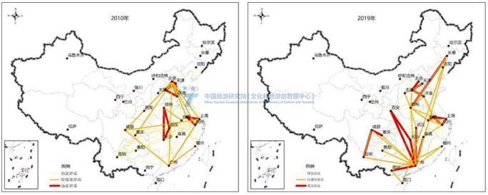 相邻省份呈现互为客源地和目的地。国内旅游客流中,高铁、民航、自驾车的出游占比不断提升,公路客运占比延续下降趋势。2019年,前100条省际旅游客流中,有64条旅游客流为相邻省份之间的旅游流动,仅有36条旅游客流为非相邻省份之间的旅游流动。城市群间游客往来构成国内旅游流“干线”和“支线”网络。全国排名前10位的省际旅游流流量占到全部930条省际旅游流的16.5%,构成了全国省际旅游流的“干线”。全国排名前11-100位的省际旅游流流量占到全部930条省际旅游流的38.6%,构成了全国省际旅游流的“支线”。构成了全国省际旅游流动网络的核心支撑。