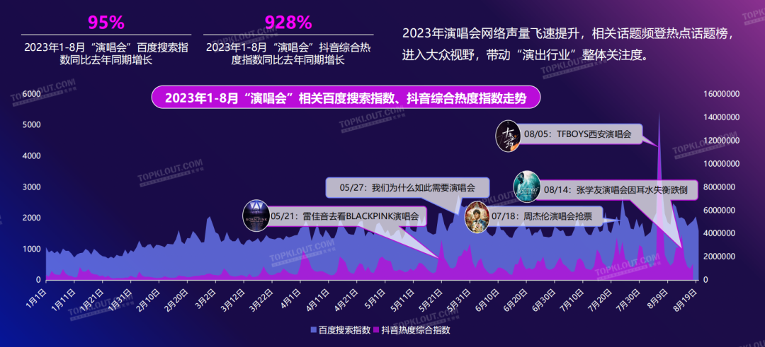 根据公开数据统计,2023年1-8月「演唱会」百度搜索指数同比去年同期增长95%,抖音综合热度指数同比去年同期增长928%,相关话题频登各大平台热点话题榜,带动“演出行业”整体关注度。