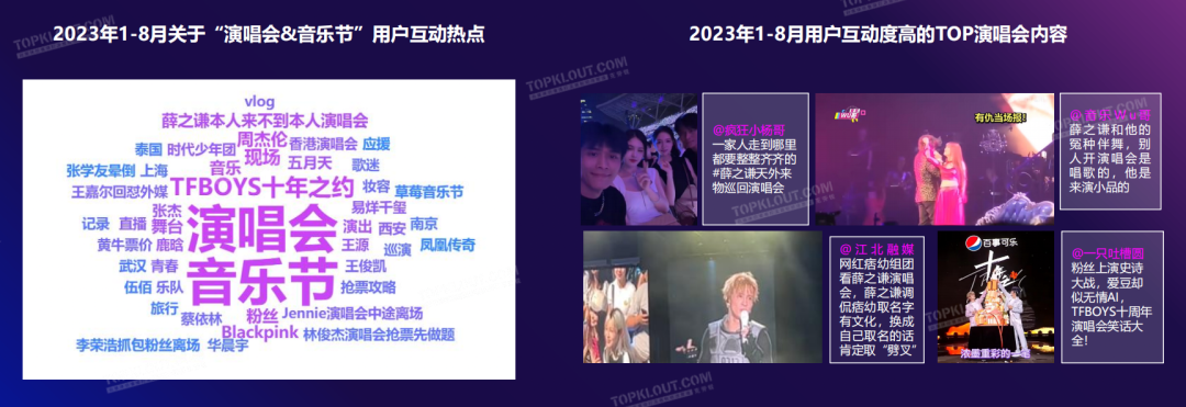 社媒用户侧,2023年1-8月“演唱会&音乐节”相关用户互动量,同比2022年同期增长4.24倍。其中,因众多明星、达人打call,及演唱会现场薛之谦和他的“冤种”伴舞互动产出多个热点话题,带动薛之谦「天外来物巡回演唱会」成为社媒互动度TOP的演唱会。