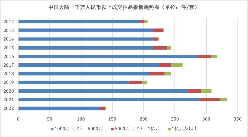 2022年,高价区间成交的中国文物艺术品拍品数量在海外地区相对保持了稳定。成交价超过一亿元人民币的超高价中国文物艺术品拍品共有5件,少于2021年的7件。但在中国内地市场,成交价高于一千万人民币的拍品数量同比锐减了57%,仅为140件。而成交额高于一亿元人民币的拍品仅有中国书画板块的一件。同时,作为支撑着市场主体的中价区间,50万-1千万人民币的中价区间内成交拍品数量也同比缩减了47%。在这两个区间的共同作用下,2022年中国文物艺术品内地市场的总成交额和成交均价都大幅降低了50%以上。