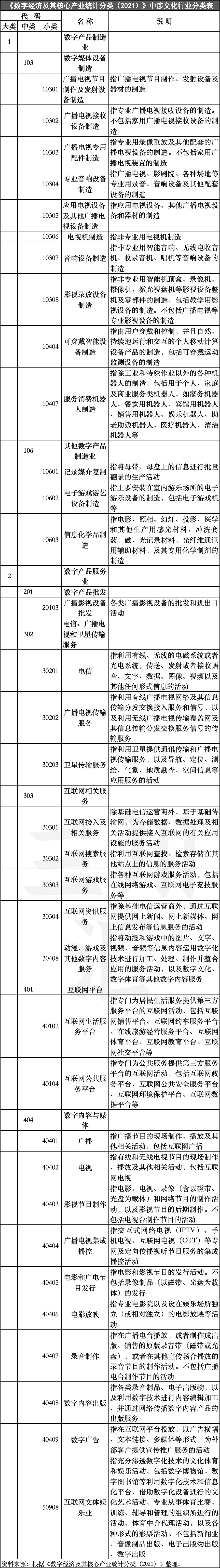 该分类从“数字产业化”和“产业数字化”两个方面出发,明确了包括数字产品制造业、数字产品服务业、数字技术应用业、数字要素驱动业、数字化效率提升业等在内的32个中类156个小类。其中,涉及文化领域相关行业共有2个大类7个中类34个小类(并非全部),主要分布于数字产品制造业、数字产品服务业两大行业之中。