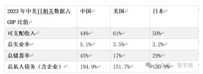 △图:中国、美国、日本人均可支配收入、总失业率、总储蓄率、私人债务(含企业)占GDP比值(2023年)来源:CEIC、国家统计局