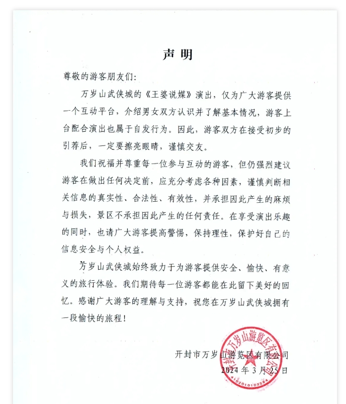 此外,公开相亲的潜在风险也需要考虑。最近,万岁山武侠城发布声明称,希望游客“擦亮眼睛,谨慎交友”,“开封王婆”也发视频提醒:“不会和任何粉丝有商业行为。”