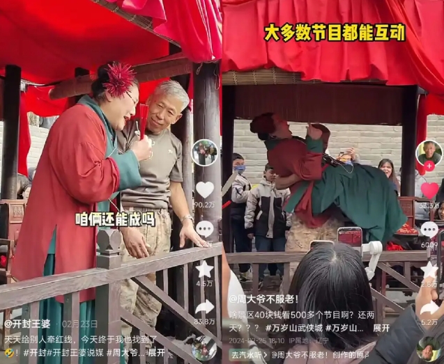“开封王婆”的第一波热度来自博主体验。2月23日,抖音千万粉博主“周大爷不服老”来到万岁山武侠城,和“开封王婆”进行了有趣互动,两人发布的视频累计获赞超123万。